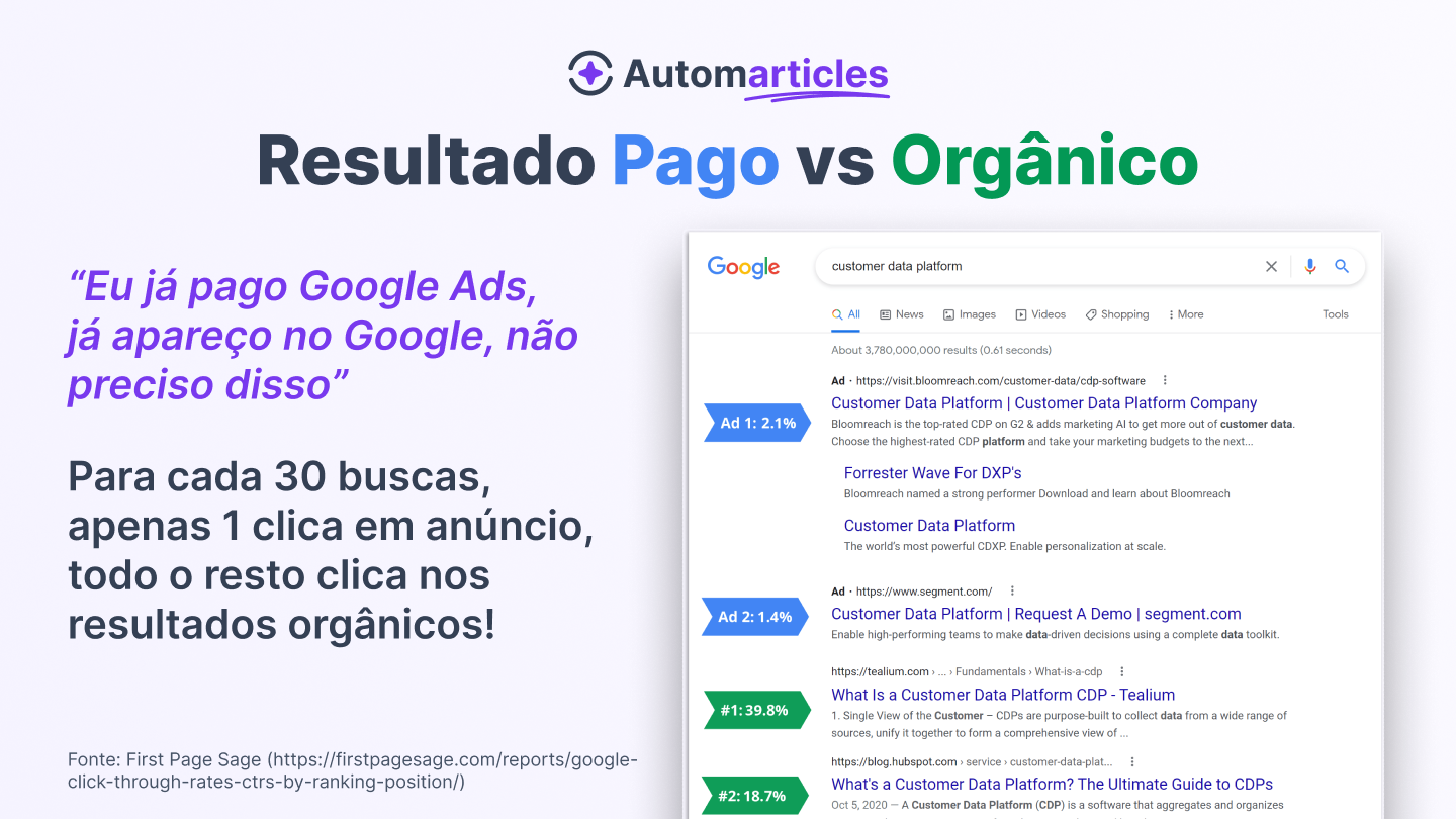 De acordo com o First Page Sage, na média, para cada 30 cliques em resultados de busca no Google, apenas 1 deles é em anúncio, todos os outros 29 são em resultados orgânicos!